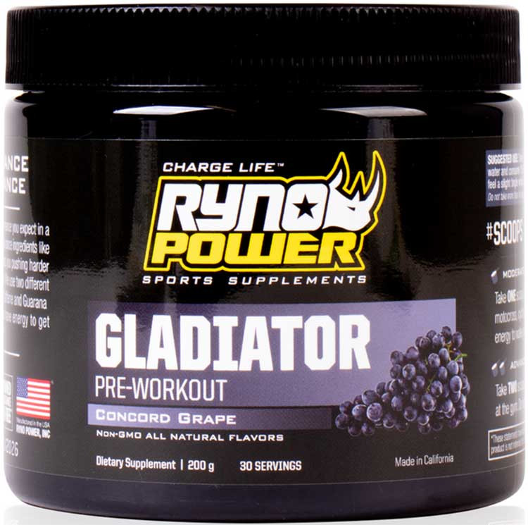 Take your energy, strength, & focus to the next level with Ryno Power's GLADIATOR. Each serving is an explosive pre-workout boost with added endurance ingredients, like Rhodiola & ActiGin, to keep you pushing harder & faster than ever before. Natural caffeine & guarana seed extract provide explosive, smooth energy to get started & keep going. Our pro athletes love GLADIATOR as its perfect for endurance activities from cycling and triathlons to motocross and mountain biking. Sweetened with plant-derived Stevia for a delicious and light Concord Grape taste.