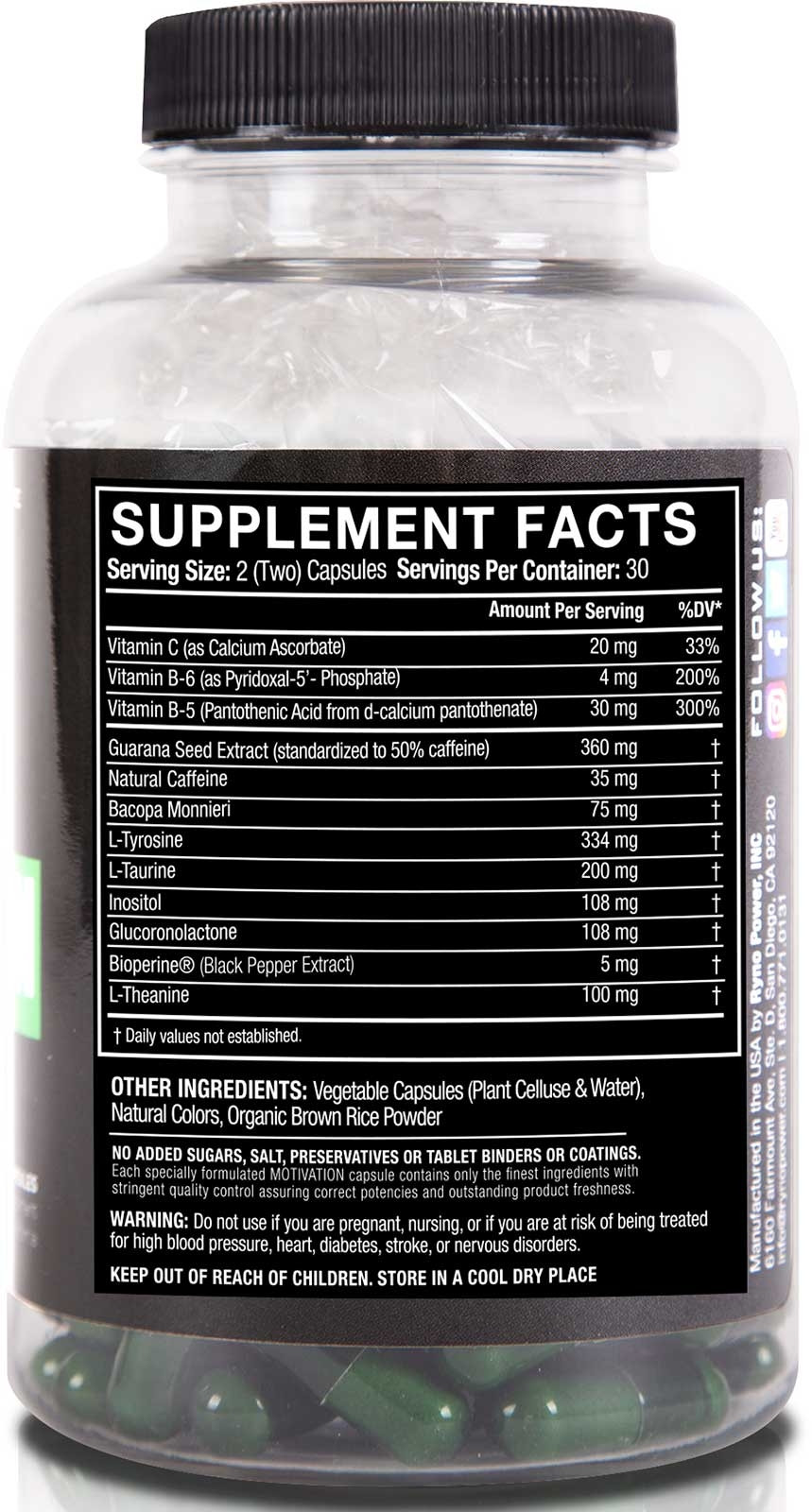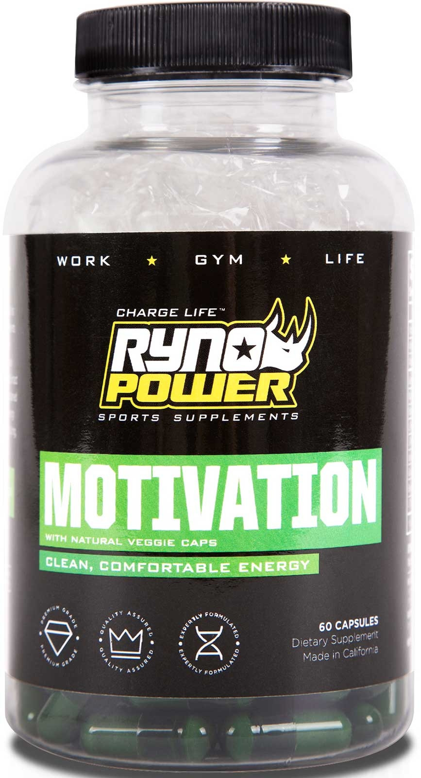Enhance your mental and physical performance with MOTIVATION. It is made with a safe & effective synergy of natural energizing ingredients & is great to keep pace for hours without mental fatigue. Tyrosine is a rare but safe ingredient we use that is shown to improve performance under stressful conditions. The Guarana Seed Extract is released slowly over as long as four hours to give you sustained energy rather than the quick boost you get from coffee or other drinks. Ryno's pro athletes love MOTIVATION for its natural formula that provides sustained energy without spikes or crashes.